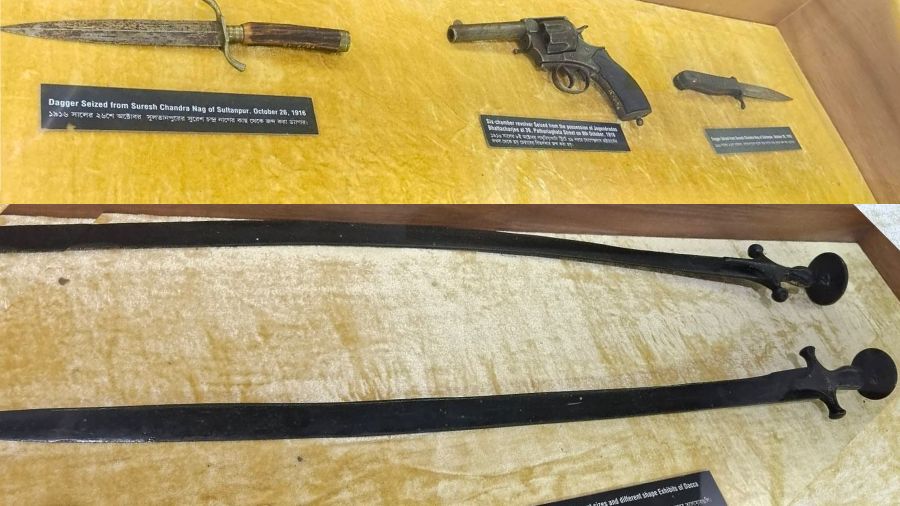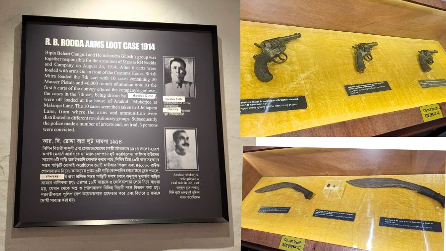 Details alongside the glass cases enumerate where these weapons were found and who used them. Another chamber in this section recounts the R.B. Rodda Arms Heist case. There are also references to the Anushilan Samiti and Bengal’s militant resistance.