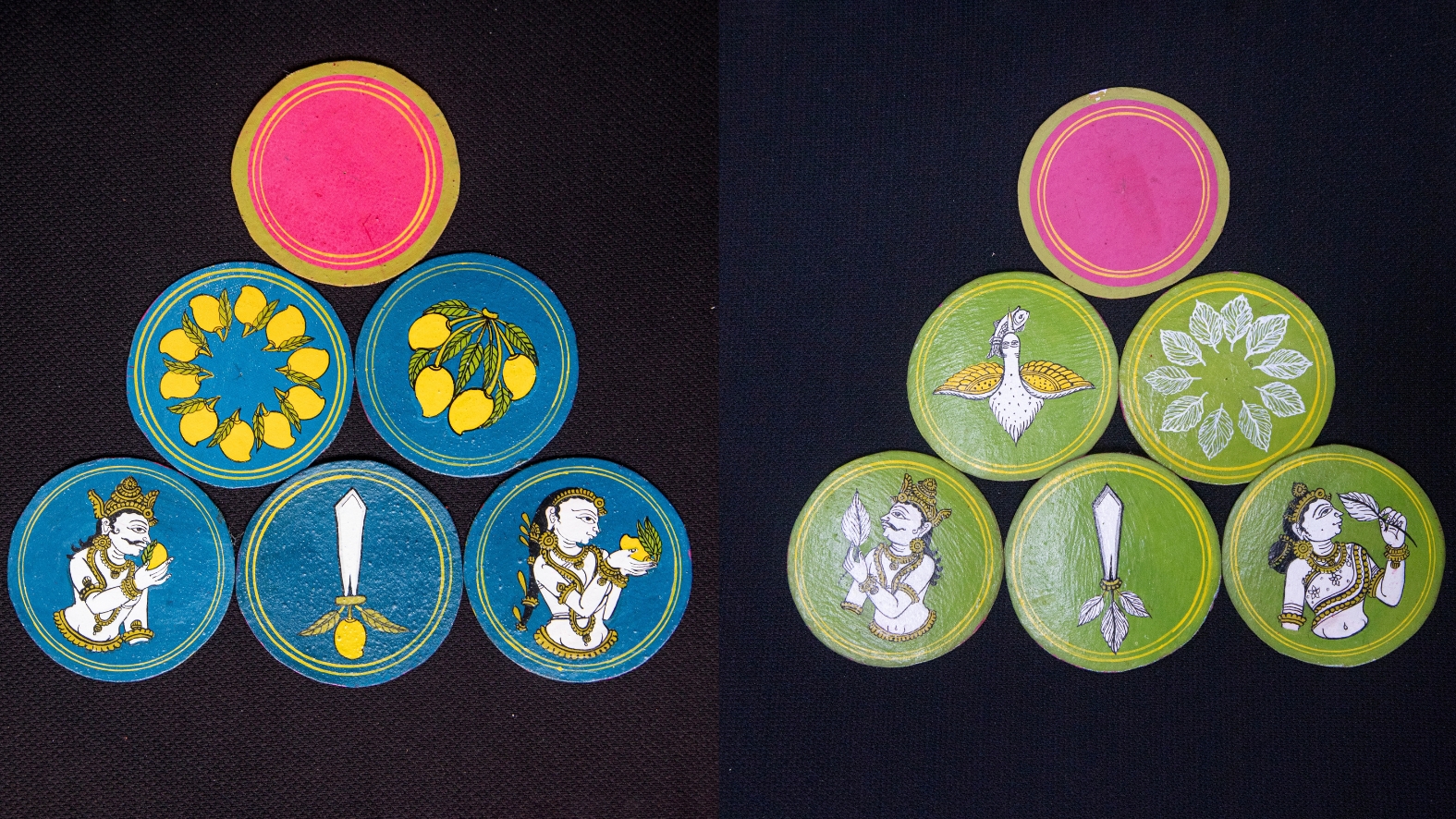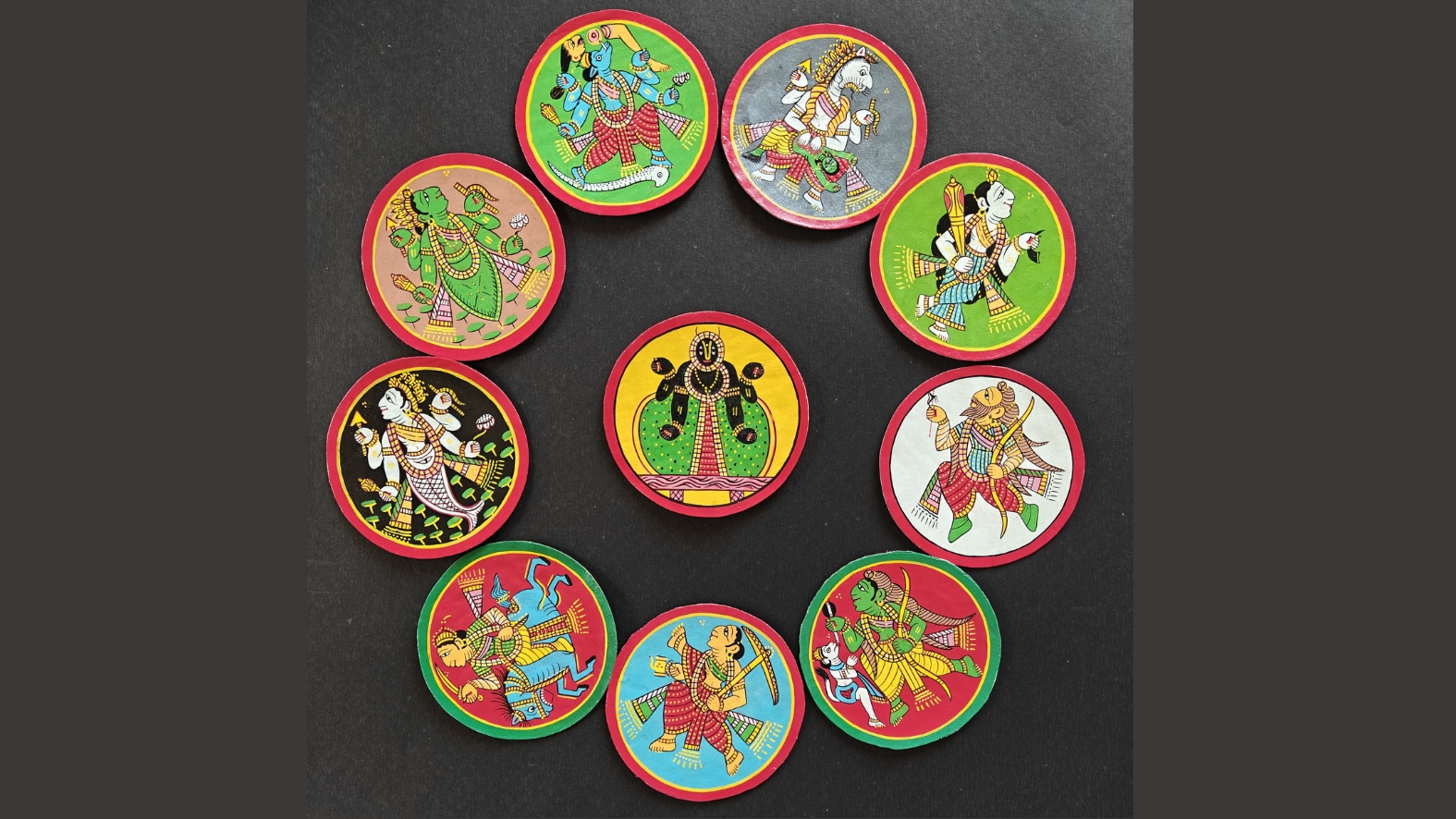 The Dashavtar cards were a pack of 120 circular handcrafted brightly coloured cards. Each suit was named after an avatar of Vishnu — Matsya (fish), Kurma (turtle), Baraha (boar), Nrisingha (a combination of man and lion), Baman (dwarf), Parshuram (the warrior sage with an axe), Ram (of Ramayana), Balaram (brother of Krishna), Buddha and Kalki (the avatar yet to come). For each avatar, there are 24 cards with distinct colours — red for Matsya and Parshuram, yellow for Ram, Balaram and Baraha and so on.