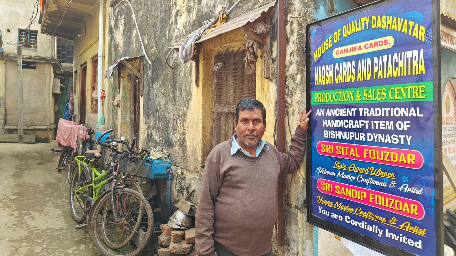 The Fouzdars of Shankhari Bazar in Bishnupur are the artists behind the intricately crafted cards. One of the first makers was Kartik Sutradhar, who painted a set of cards in the Odisha patachitra style and impressed King Bir Hambir and earned the title of Fouzdar. Since then, generation after generation, the Fouzdars have been making Dashavtar cards and also painting Durga patas for the royal family.