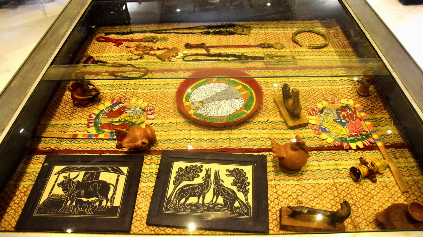 The museum's narrative also extends beyond Bengal. The presence of artefacts from tribal communities across India create a broader, pan-Indian perspective. Displays from the Angami tribe of Nagaland include intricate neck pieces and ornaments, wall hangings from the Kodava tribe bring texture and pattern into the museum space and Bhil artworks introduce bursts of colour and symbolic imagery, reflecting a worldview deeply entwined with forests and wildlife.
