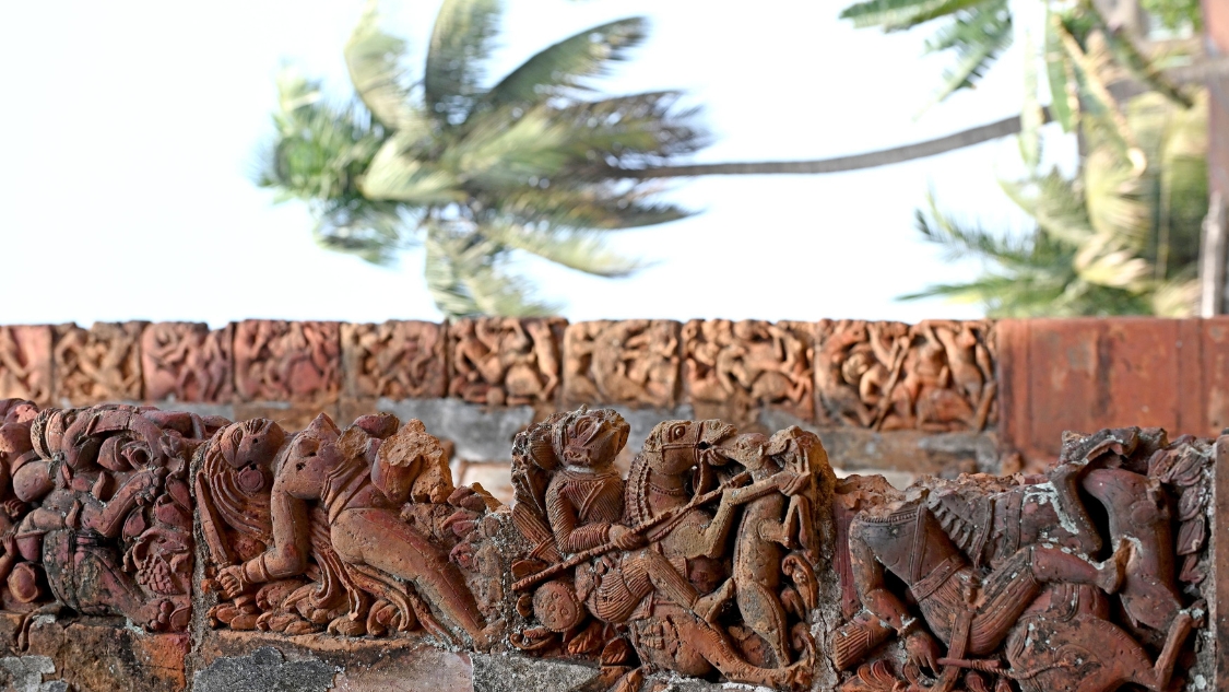 The temple’s terracotta panels are a feast for the eyes. Two aatchala-like structures form the gate of the temples that lead into its central courtyard. Devotional scenes of Radha and Krishna in playful repose intermingle with more worldly tableaux — boats gliding along riverine canals, village musicians mid-performance and hunters on horseback, all rendered with astonishing precision. A panel depicting the divine marriage of Krishna and Rukmini stands out, the figures delicate yet vibrant, each expression captured in clay with almost photographic realism.
