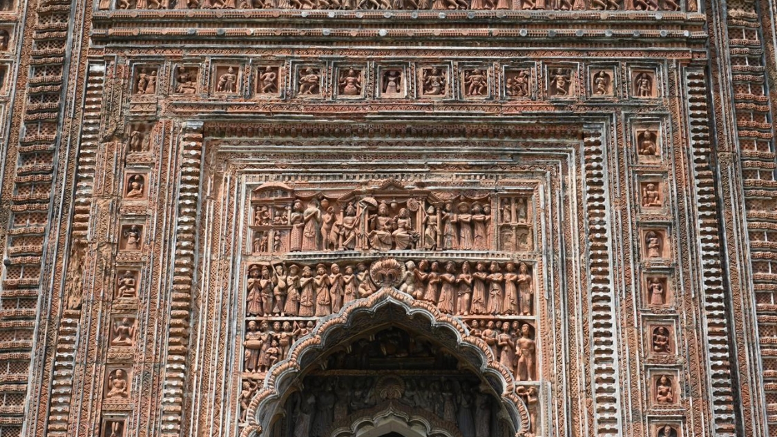 The temple’s exterior is a tapestry of elaborate terracotta carvings, with every elevation telling a story in clay. Across its walls unfold epic narratives — the battle between Ram and Ravan, the fierce triumph of goddess Durga as Mahishasuramardini and Ram enthroned as the king of Ayodhya with Sita by his side. A sprawling horizontal panel celebrates the many facets of Krishna-lila, capturing divine playfulness alongside devotion. One can also catch glimpses of life in 18th-century Bengal — processions, musicians and everyday social scenes. Intriguingly, three of the four doors are mere stone façades, masterfully crafted to appear functional. Only close examination would reveal that they are not real doors. The craftsmanship is so refined that the carvings on the doorway appear sculpted rather than moulded.