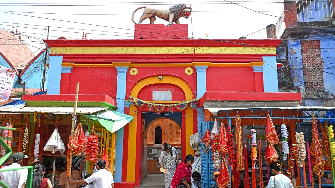 The sanctum houses a black stone idol of Kali, adorned with fresh flowers, vermilion and flickering lamps. Devotees offer prayers throughout the day. The lane outside is a busy one, interspersed with shops selling sweets, flowers and other offerings.