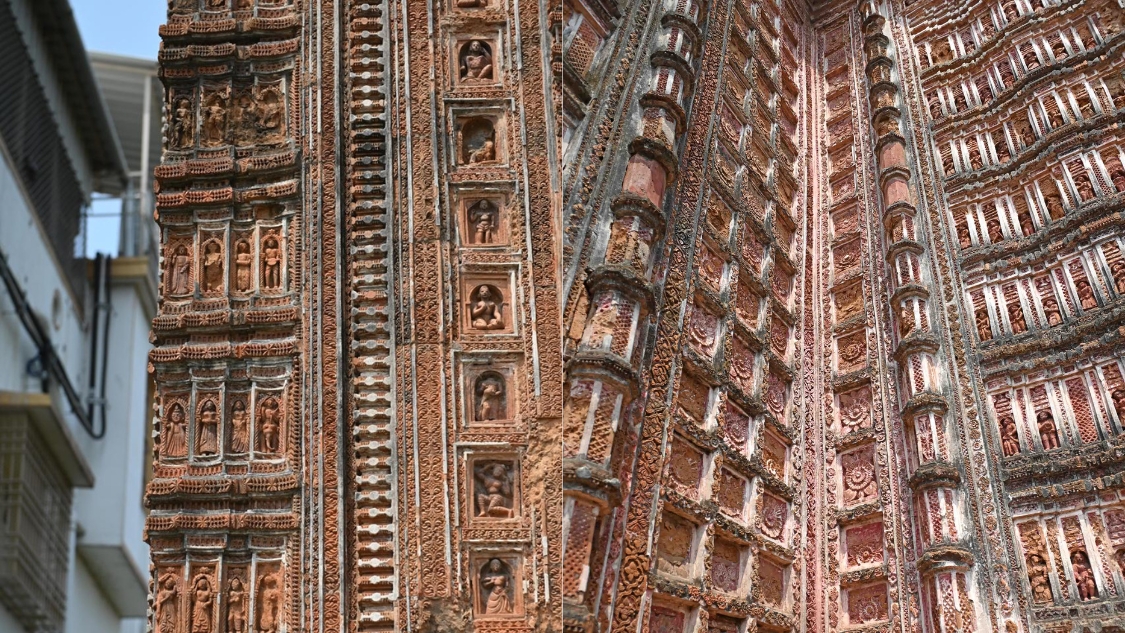 The Girigovardhana temple, too, has terracotta panels depicting the life of Krishna while its roof is adorned with mythical characters and animals.