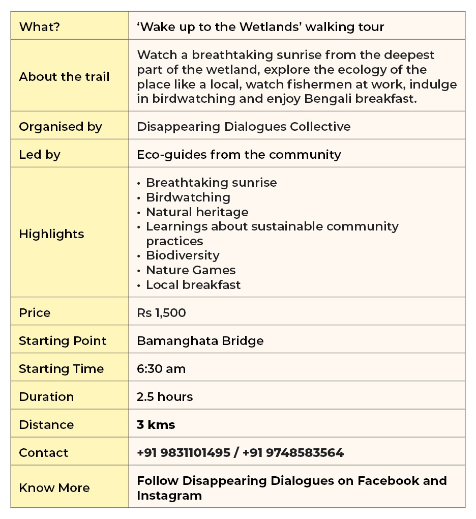 The trails go beyond sightseeing; offering participants an immersive insight into the community, their practices and the environment. It isn’t just about watching the EKW from afar, but engaging with it personally. “You could watch women weave, fishermen catch fish or people tend to their self-sustainable vegetable gardens in their backyards. In winters, you notice the locals making fresh and aromatic nolen gur. You can even buy it directly from the source,” says artist Nobina Gupta, founder-director of Disappearing Dialogues, which organises the walks.