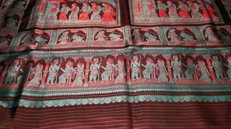 If Dhonekhali and Shantipur belong to the world of cotton, Baluchari is silk's most theatrical offering. Originating in Murshidabad, this tradition transforms the border and the aanchal, the sari's decorative end, into a canvas for storytelling. Scenes from the Ramayan, folk tales, courtly figures: all are woven in with a level of flair and extravagance that sets the Baluchari apart from almost any other Indian textile. The tradition has spread widely, today some of the finest Balucharis are woven in Banaras, but a revival in Bengal has brought renewed attention to the original tradition. For a visitor seeking to bring home something that is simultaneously textile and narrative, a Baluchari is extraordinary.
